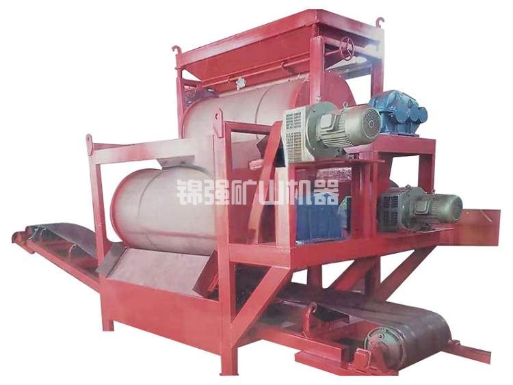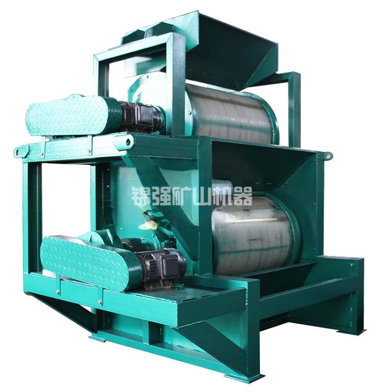 強磁雙輥干式磁選機皮帶上;當物料通過強磁輥時,磁性物質由于受磁力的吸附作用被吸附到強磁輥上,被皮帶帶入磁性物料集料斗中;非磁性物料及未被選凈的磁性物料隨著皮帶的轉動受重力作用,脫離磁場并下落到下一層皮帶上繼續選別;這樣,經過幾道磁選之后就能選別出合格產品。